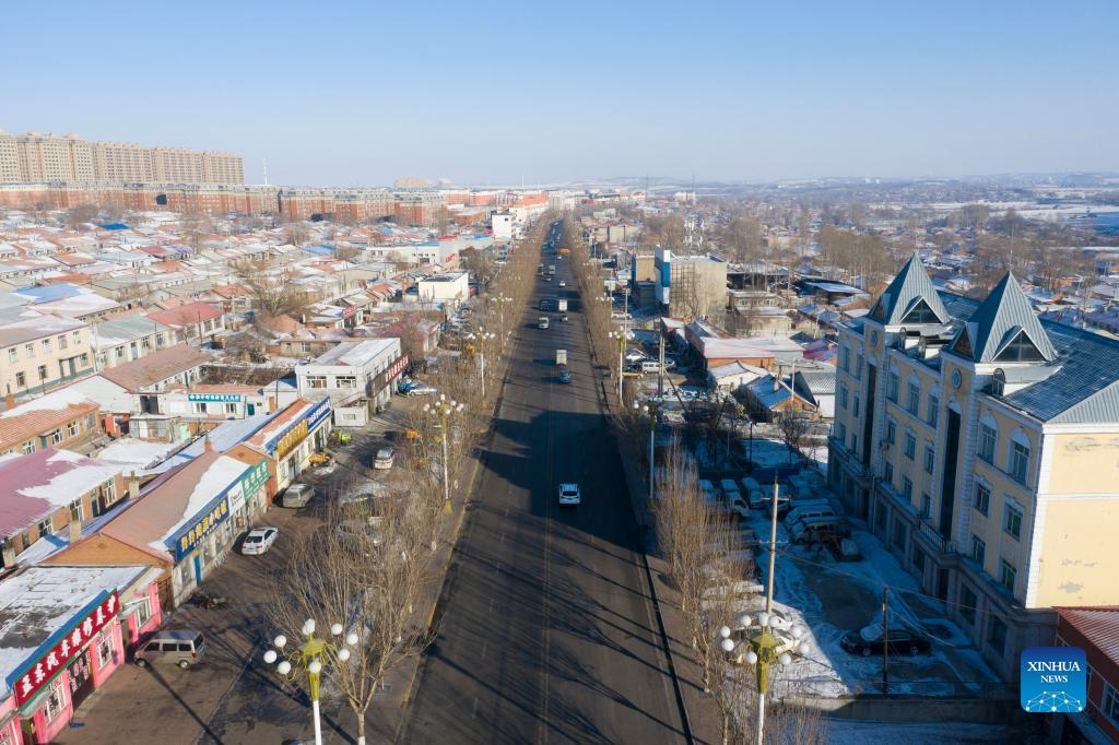 Aerial photo taken on Jan. 12, 2022 shows a street named after China's first Winter Olympic champion Yang Yang in Qitaihe City, northeast China's Heilongjiang Province. To date, six of China's 13 Winter Olympic gold medals have been claimed by athletes trained in Qitaihe City. The city has been stepping up efforts to train winter sports talents in recent years by building schools that teach short track speed skating, setting up training base for provincial sports team, as well as holding ice and snow sports events. (Xinhua/Xie Jianfei)