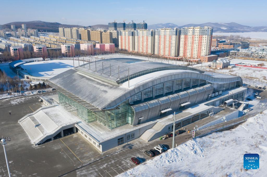 Aerial photo taken on Jan. 12, 2022 shows the exterior of Qitaihe Sports Center in Qitaihe City, northeast China's Heilongjiang Province. To date, six of China's 13 Winter Olympic gold medals have been claimed by athletes trained in Qitaihe City. The city has been stepping up efforts to train winter sports talents in recent years by building schools that teach short track speed skating, setting up training base for provincial sports team, as well as holding ice and snow sports events. (Xinhua/Xie Jianfei)
