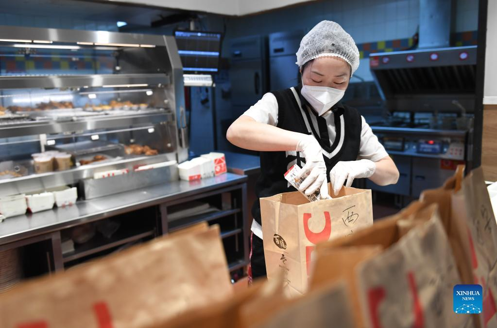 A staff member packs takeouts at a restaurant in Xi'an, capital of northwest China's Shaanxi Province, Jan. 13, 2022. Local authorities advance the orderly resumption of catering service as the city is witnessing a continuing drop of local COVID-19 cases amid the latest resurgence. Catering enterprises will receive take-out orders with COVID-19 prevention measures but dine-in services will remain suspended. (Xinhua/Li Yibo)