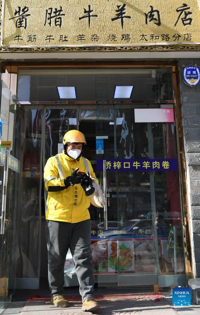 Delivery man Kong Weijian fetches takeout food to be delivered to customers in Xi'an, capital of northwest China's Shaanxi Province, Jan. 12, 2022. Local authorities advance the orderly resumption of catering service as the city is witnessing a continuing drop of local COVID-19 cases amid the latest resurgence. Catering enterprises will receive take-out orders with COVID-19 prevention measures but dine-in services will remain suspended. (Xinhua/Li Yibo)