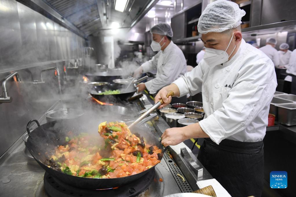 Cooks make food at a restaurant in Xi'an, capital of northwest China's Shaanxi Province, Jan. 13, 2022. Local authorities advance the orderly resumption of catering service as the city is witnessing a continuing drop of local COVID-19 cases amid the latest resurgence. Catering enterprises will receive take-out orders with COVID-19 prevention measures but dine-in services will remain suspended. (Xinhua/Li Yibo)