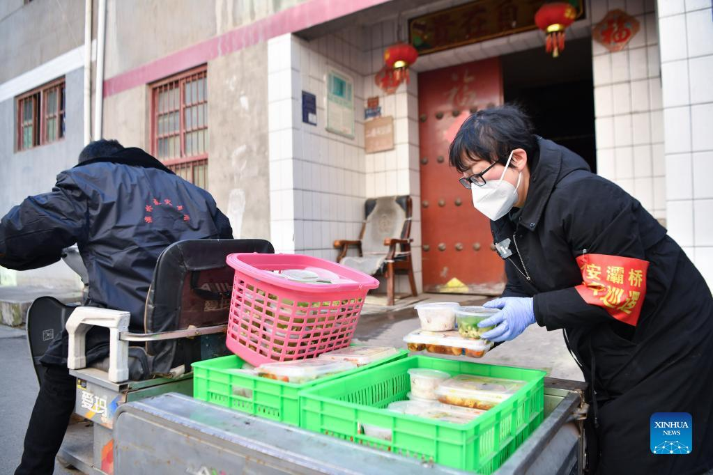 A staff member delivers lunch to a senior citizen who lives alone in Sanjia Village of Baqiao District in Xi'an, capital of northwest China's Shaanxi Province, Jan. 12, 2022. Located in Baqiao District of Xi'an, Sanjia Village is an "urban village" inhabited by floating population such as migrant workers. An activity organized to provide two meals for free to residents in need was carried out in the village after the city has been hit by the recent COVID-19 resurgence. (Xinhua/Zhang Bowen)