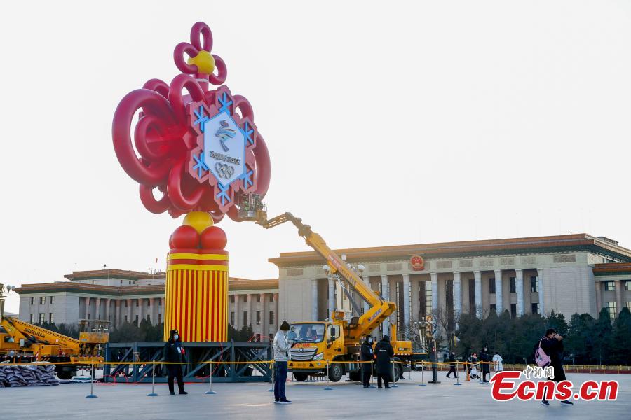 Workers install the Winter Olympics landmark at Tiananmen Square in Beijing, January 13, 2022. (Photo: China News Service/Yi Haifei)