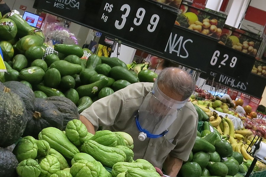 A man wearing a protective shield is seen at a supermarket in Sao Paulo, Brazil, on June 25, 2020. (Xinhua/Rahel Patrasso)