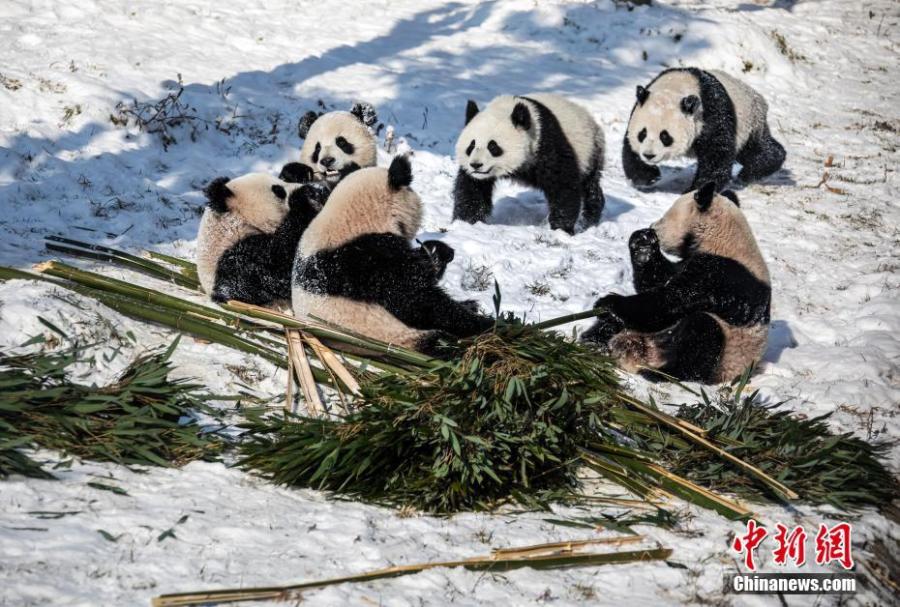 Pandas have fun in the snow world in Wenchuan County of China’s Sichuan Province, January 13, 2022. (Photo: China News Service/Chen Xianlin)