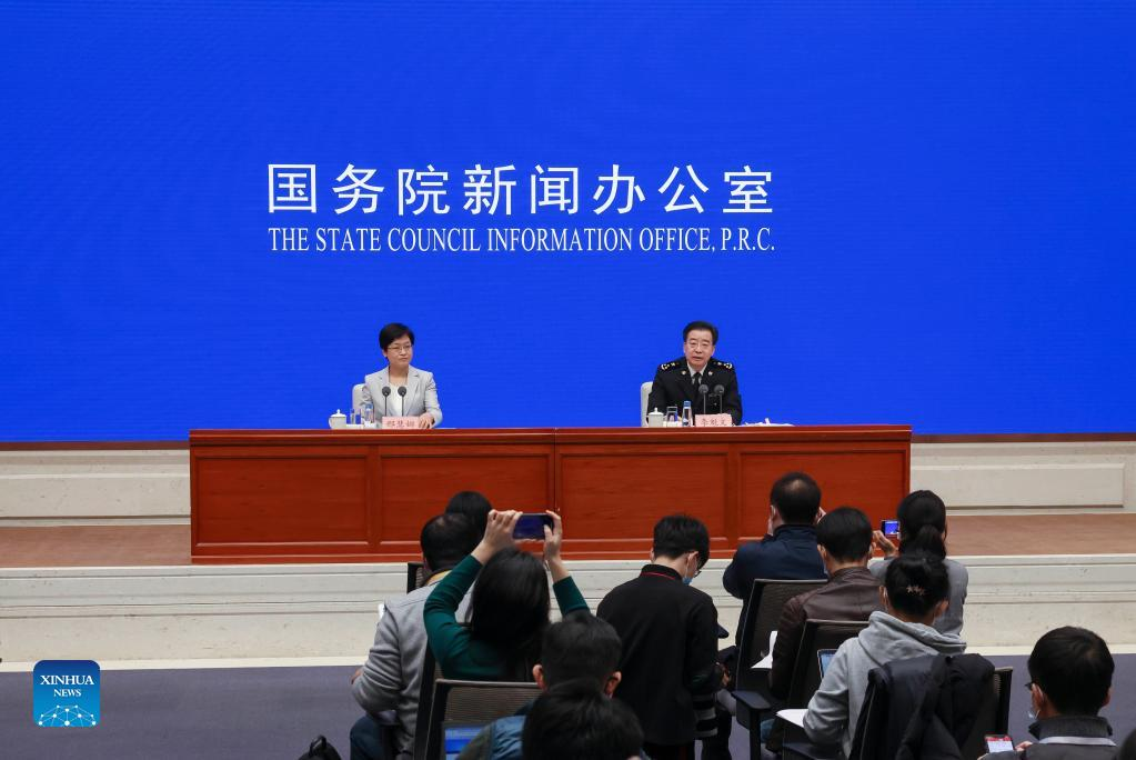 Li Kuiwen (back R), spokesperson of the General Administration of Customs (GAC), attends a press conference held by the State Council Information Office in Beijing, capital of China, Jan. 14, 2022. (Xinhua/Yin Gang)