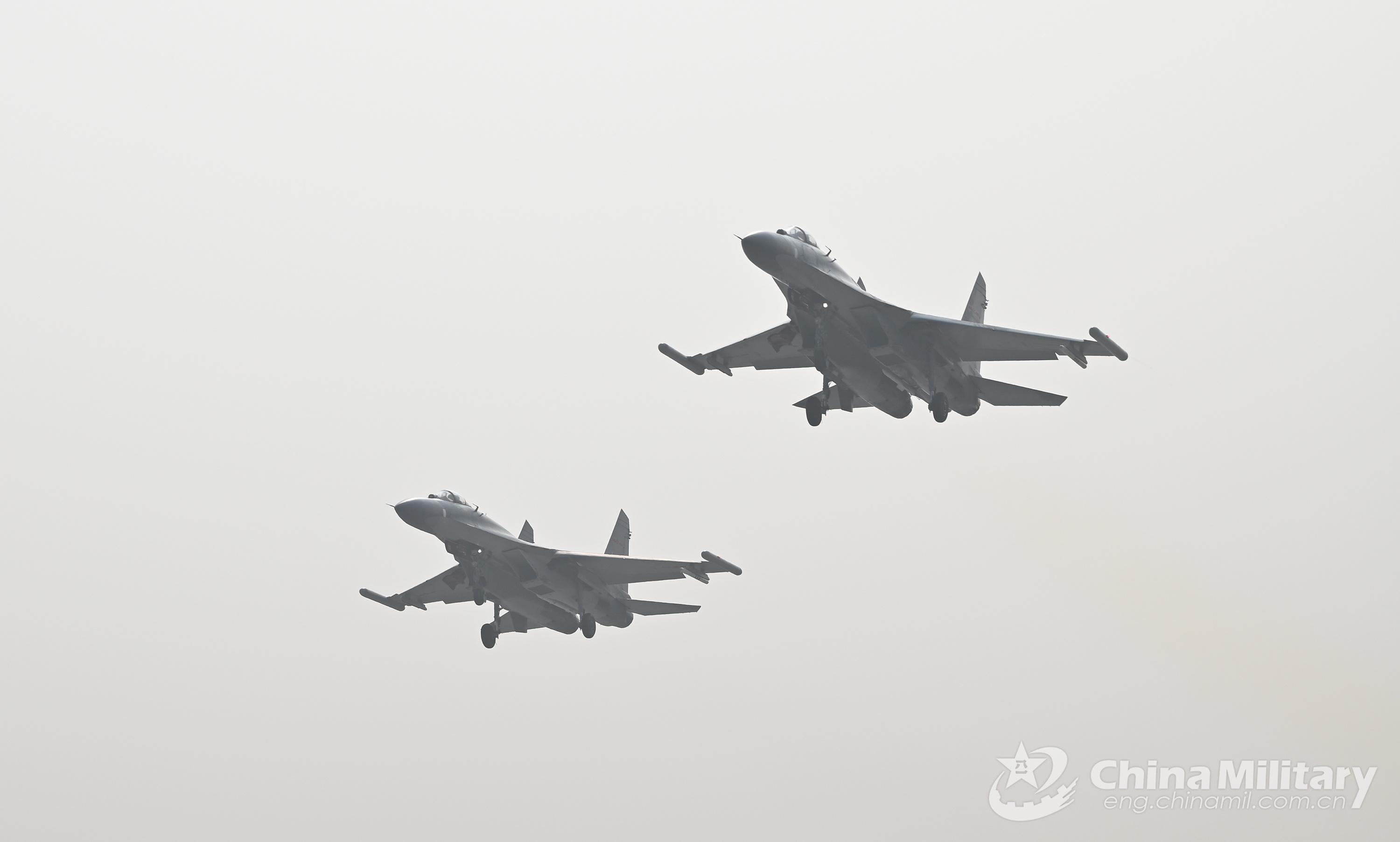 Two fighter jets attached to an aviation brigade of the air force under the PLA Western Theater Command take off to the target air space in two-plane formation during a live-fire air battle training exercise on January 7, 2022, which aims to beef up the pilots’ air combat capability. (eng.chinamil.com.cn/Photo by Zhao Tian)