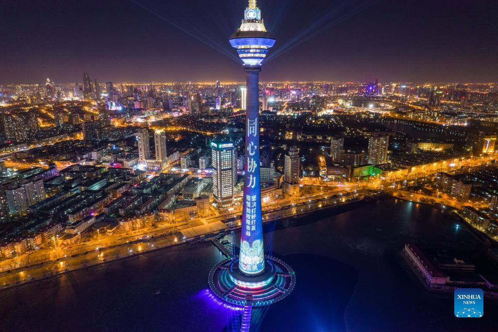 Aerial photo shows a landmark lit up to pay tribute to people making efforts to fight against the recent resurgence of COVID-19 pandemic in north China's Tianjin, Jan. 13, 2022. (Xinhua)