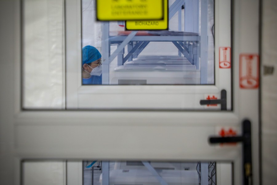 A staff member works at an air-inflated laboratory for COVID-19 nucleic acid testing in Anyang of central China's Henan Province, Jan. 12, 2022. (Photo by Ma Xiaoran/Xinhua)