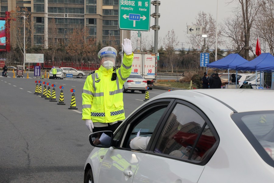 Policemen are on duty at a toll gate in Anyang, central China's Henan Province, Jan. 14, 2022. (Photo by Ma Xiaoran/Xinhua)