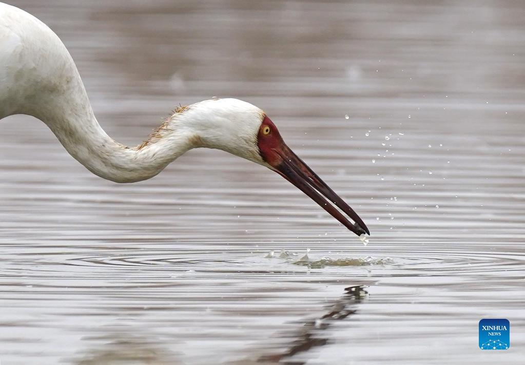 A white crane forages at Nanchang Five Stars Siberian Cranes Sanctuary by the Poyang Lake in Nanchang, east China's Jiangxi Province, Jan. 12, 2022. Poyang Lake, the country's largest freshwater lake, is an important wintering spot for migratory birds. To ramp up forage supplies for the birds, in 2021, the local government of Yugan County issued a compensation policy for farmers, and reserved rice for migratory birds. In Nanchang Five Stars Siberian Cranes Sanctuary by the Poyang Lake, cranes have been attracted there for food on a lotus pond. The pond, initiated and invested in by bird lovers in 2017, is expected to provide enough food for the cranes in winter. With the support of local authorities, the pond is also developed into a base for scientific research and education, as well as for international exchanges. (Xinhua/Wan Xiang)