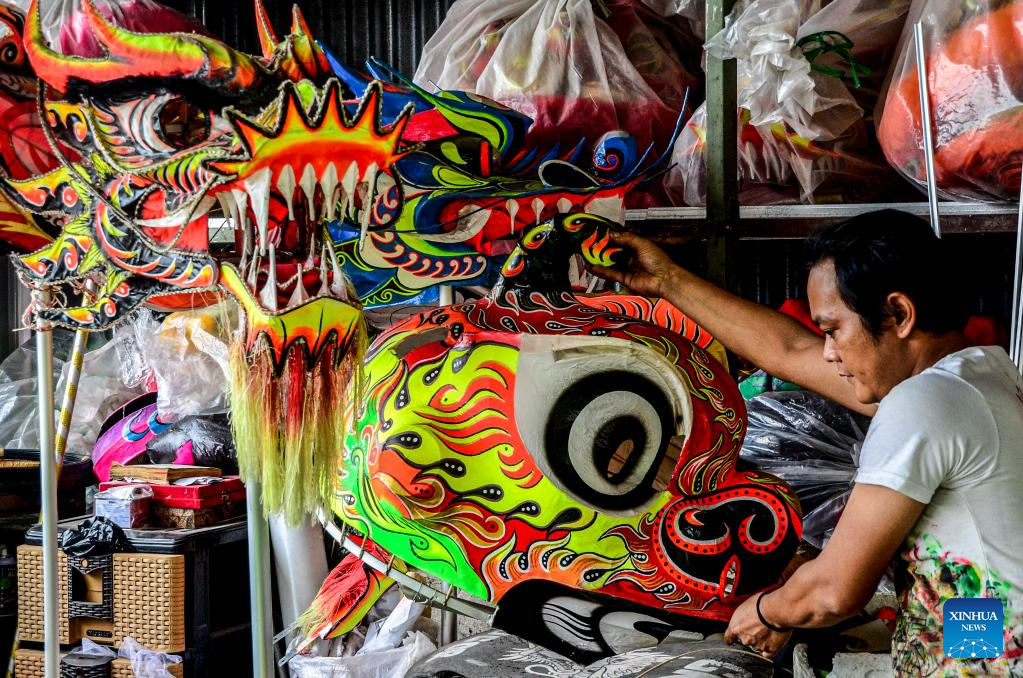 A worker holds a newly-made traditional lion head for the upcoming Chinese New Year celebration in Bogor, West Java, Indonesia, on Jan. 15, 2022. (Photo by Sandika Fadilah/Xinhua)