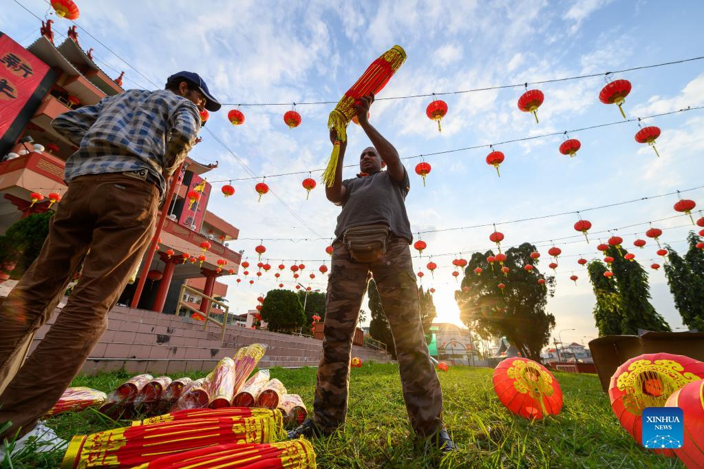 People hang lanterns for the upcoming Spring Festival, or the Chinese Lunar New Year, in Klang of Selangor states, Malaysia, Jan. 16, 2022. (Photo by Chong Voon Chung/Xinhua)