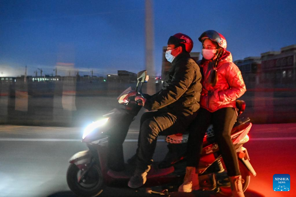 Abudulezizi Maisedi carrying his wife Maynurhan Amang (R) with electric bicycle is seen on the way to work at Tianjin industrial park in Yutian County, northwest China's Xinjiang Uygur Autonomous Region, Jan. 14, 2022. Yutian County, once a poverty-stricken area in Xinjiang, has stepped up the development of labour-intensive industries including textile, clothes and sock making.