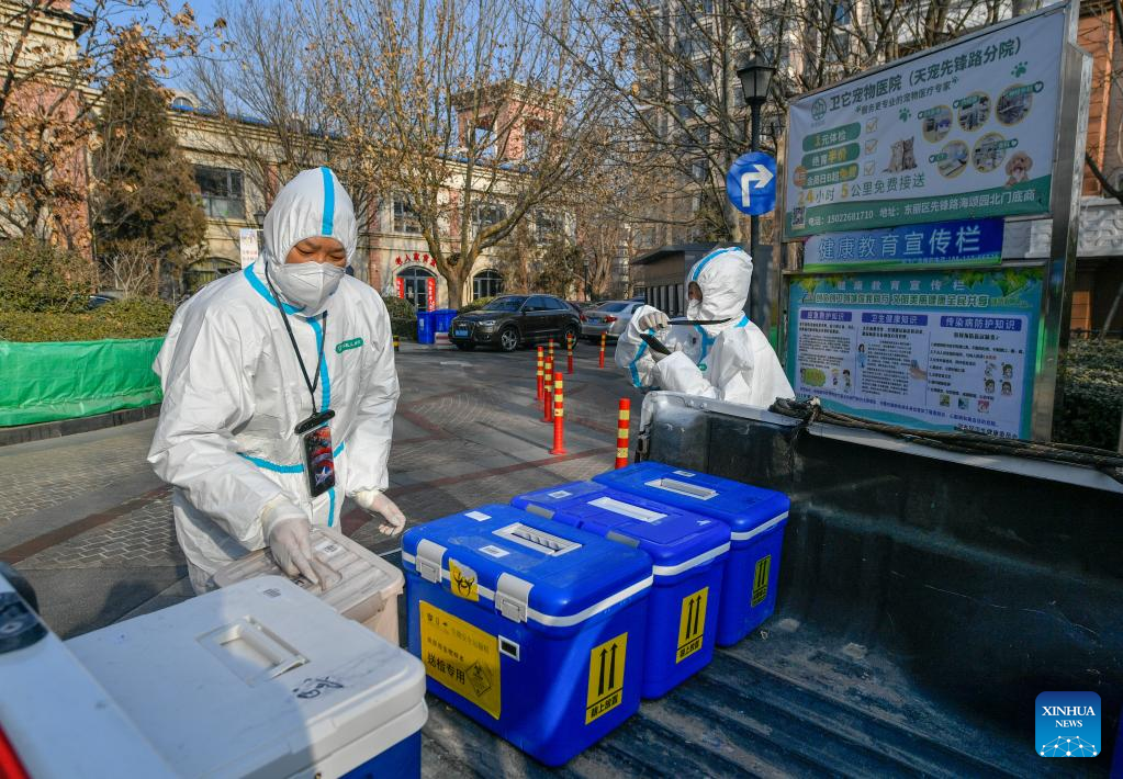 Medical workers transport boxes containing swab samples for nucleic acid tests at a COVID-19 testing site in north China's Tianjin, Jan. 15, 2022. North China's Tianjin Municipality launched the third round of citywide nucleic acid testing at 7 a.m. Saturday. (Xinhua/Sun Fanyue)