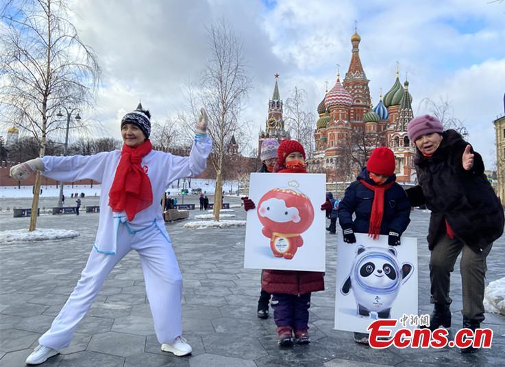 Overseas Chinese and local Tai Chi fans pose for a group photo during an activity to welcome the upcoming Beijing 2022 Winter Olympics, in Moscow, Russia, Jan. 16, 2022. (Photo: China News Service/Tian Bing)