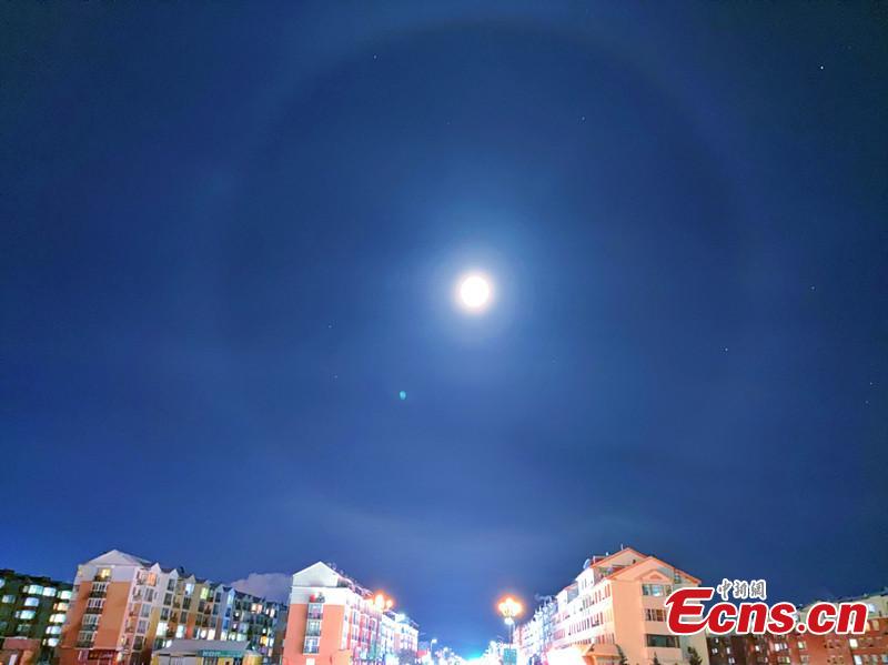 Lunar halo appears over Genhe city, China's pole of cold, in Inner Mongolia Autonomous Region, Jan.16, 2022. (Photo:China News Service/Liu Liping)