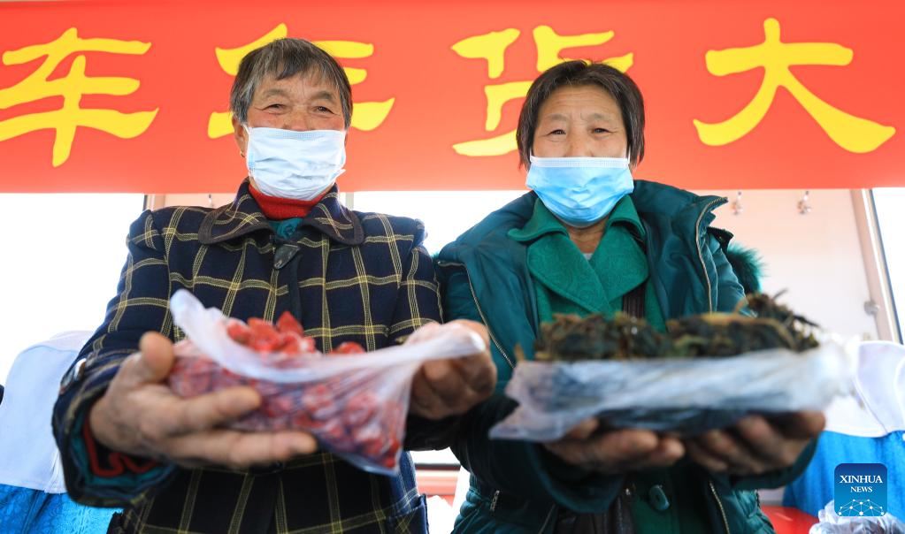Villagers display their goods for sale on train No. 4318 in northeast China's Liaoning Province, Jan. 15, 2022. Trains No. 4317 and 4318 are "slow trains" operating between Tonghua of Jilin Province and Dandong of Liaoning Province in northeast China. In the run-up to the Lunar New Year, the local railway authorities have been organizing onboard markets which allow villagers living along the trains' route to sell goods to passengers without leaving the train cars. (Xinhua/Yang Qing)