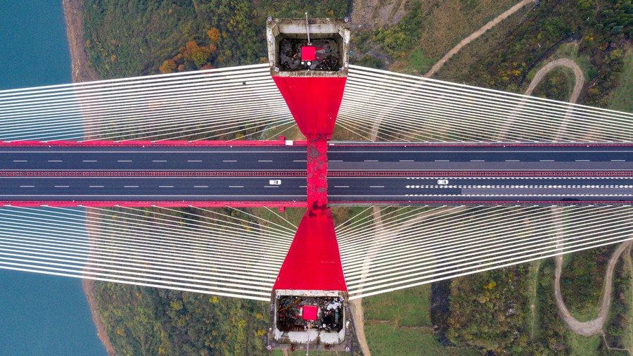 Aerial photo taken on Nov. 26, 2021 shows the Yachihe Bridge of Guiyang-Qianxi Expressway in southwest China's Guizhou Province. (Xinhua/Ou Dongqu)