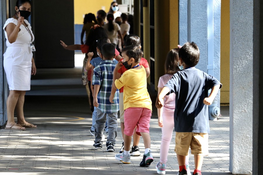Students line up for their snacks at Montrara Ave. Elementary School in Los Angeles, California, the United States, on Aug. 16, 2021. (Xinhua)