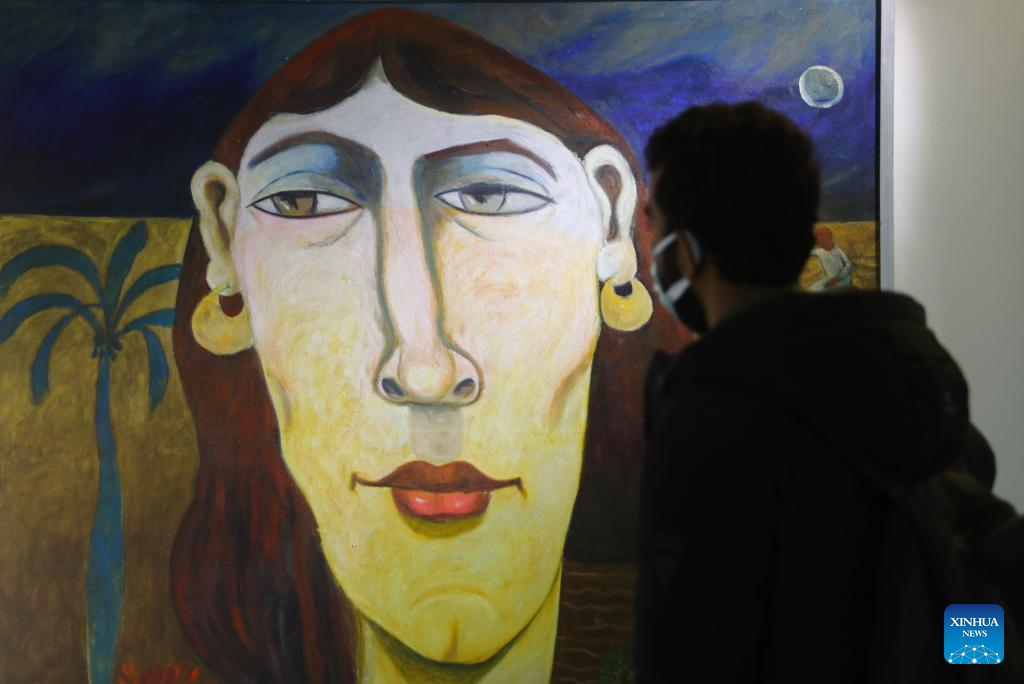A visitor views a painting at an art exhibition during Egypt's 1st World Art Forum in Cairo, Egypt, on Jan. 16, 2022. (Xinhua/Sui Xiankai)
