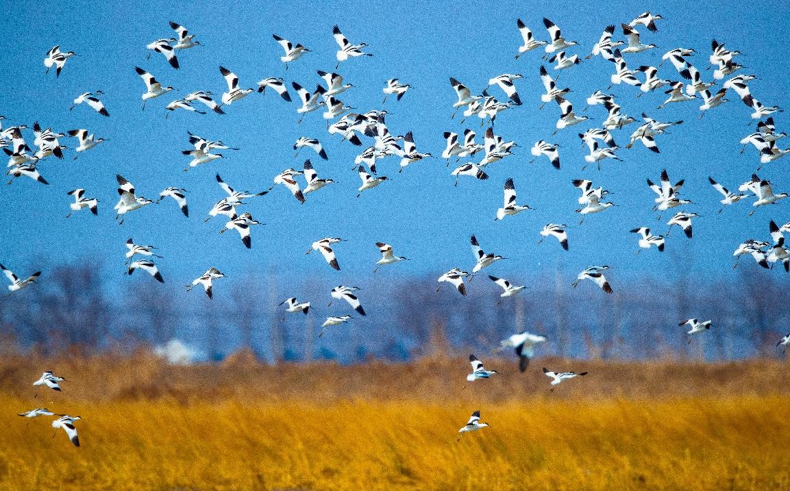 Pied avocets fly over the Tiaozini wetland, Dongtai, east China’s Jiangsu province, Jan. 6, 2022. (People’s Daily Online/Sun Jialu)