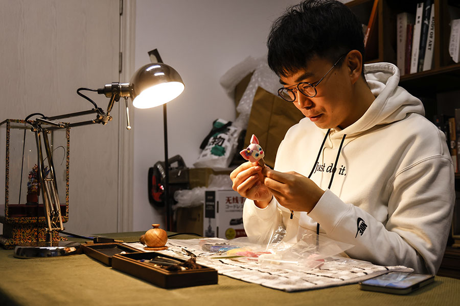 Lang Jiaziyu crafts the shape of his figurine in the image of LinaBell, a cartoon character, with various tools inside his studio. (People’s Daily Online/Peng Yukai)