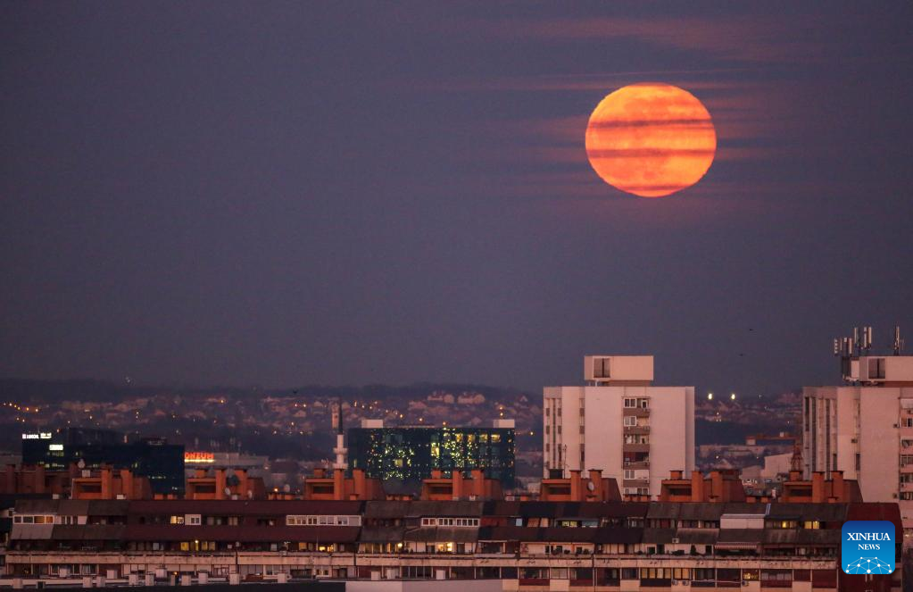 Photo taken on Jan. 18, 2022 shows a full Moon above Zagreb, Croatia. (Igor Soban/PIXSELL via Xinhua)