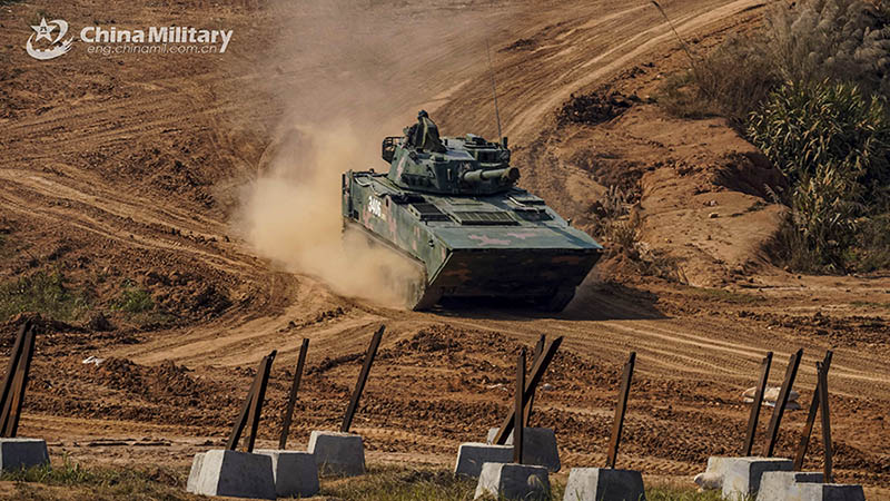An armored vehicle attached to a brigade under the PLA 73rd Group Army dashes through a mound of dust during a training exercise on January 4, 2022. (eng.chinamil.com.cn/Photo by Zeng Bingyang)