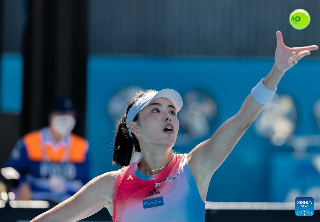 Wang Qiang of China serves during the Women's Singles second round match against Alison Van Uytvanck of Belgium at Australian Open 2022 in Melbourne, Australia, Jan. 19, 2022. (Photo by Hu Jingchen/Xinhua)