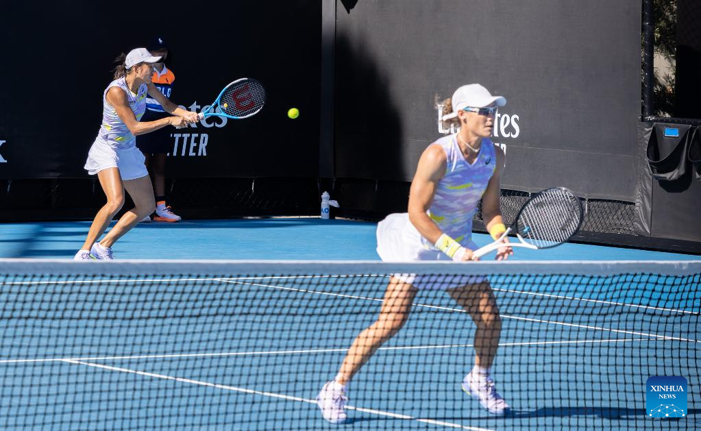 Zhang Shuai (L) of China/Samantha Stosur of Australia compete during the Women's Doubles first round match against Kato Miyu of Japan /Sabrina Santamaria of the United States at Australian Open 2022 in Melbourne, Australia, Jan. 19, 2022. (Photo by Hu Jingchen/Xinhua)