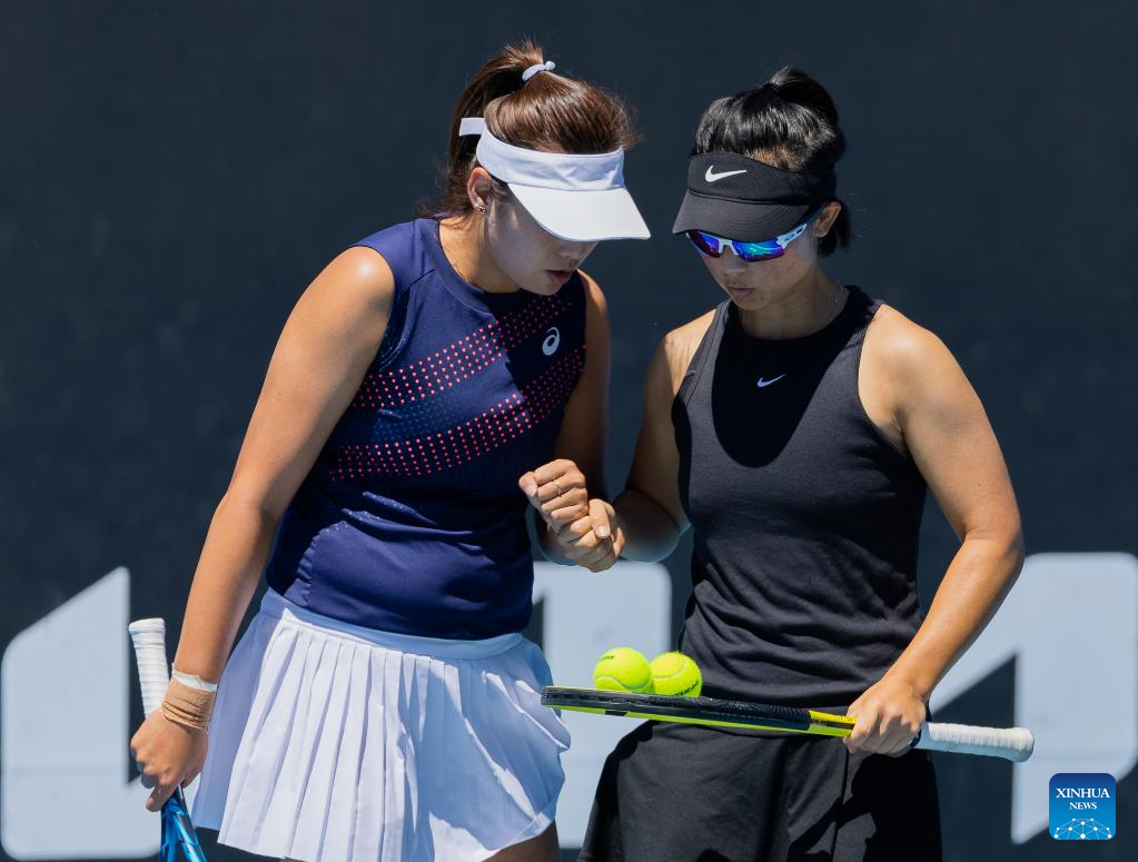 Xu Yifan (R)/Yang Zhaoxuan of China communicate with each other during the Women's doubles match against Sofia Kenin of USA/Yulia Putintseva of Kazakhstan at Australian Open in Melbourne Park, in Melbourne, Australia, Jan. 19, 2022. (Photo by Hu Jingchen/Xinhua)