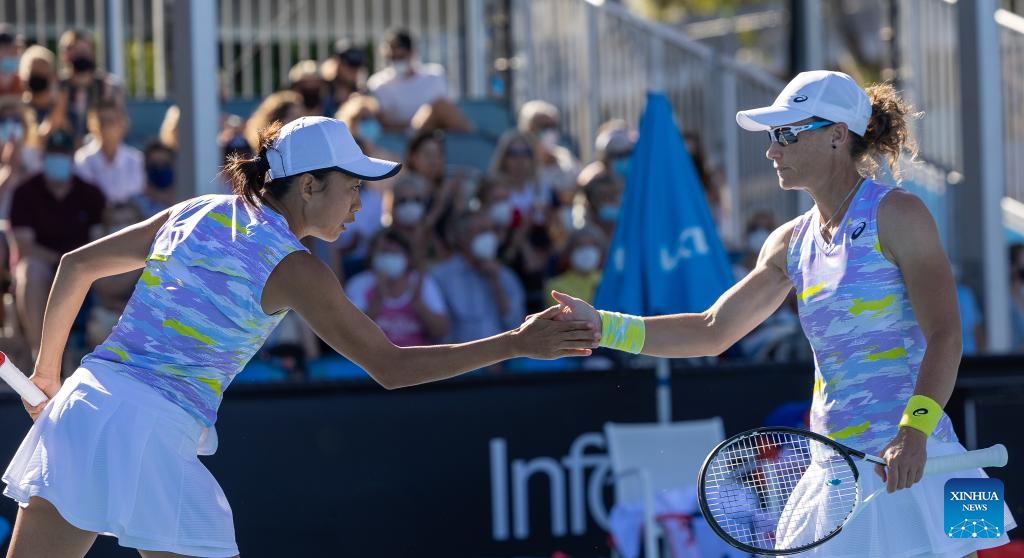Zhang Shuai (R) of China/Samantha Stosur of Australia compete during the Women's Doubles first round match against Kato Miyu of Japan /Sabrina Santamaria of the United States at Australian Open 2022 in Melbourne, Australia, Jan. 19, 2022. (Photo by Hu Jingchen/Xinhua)