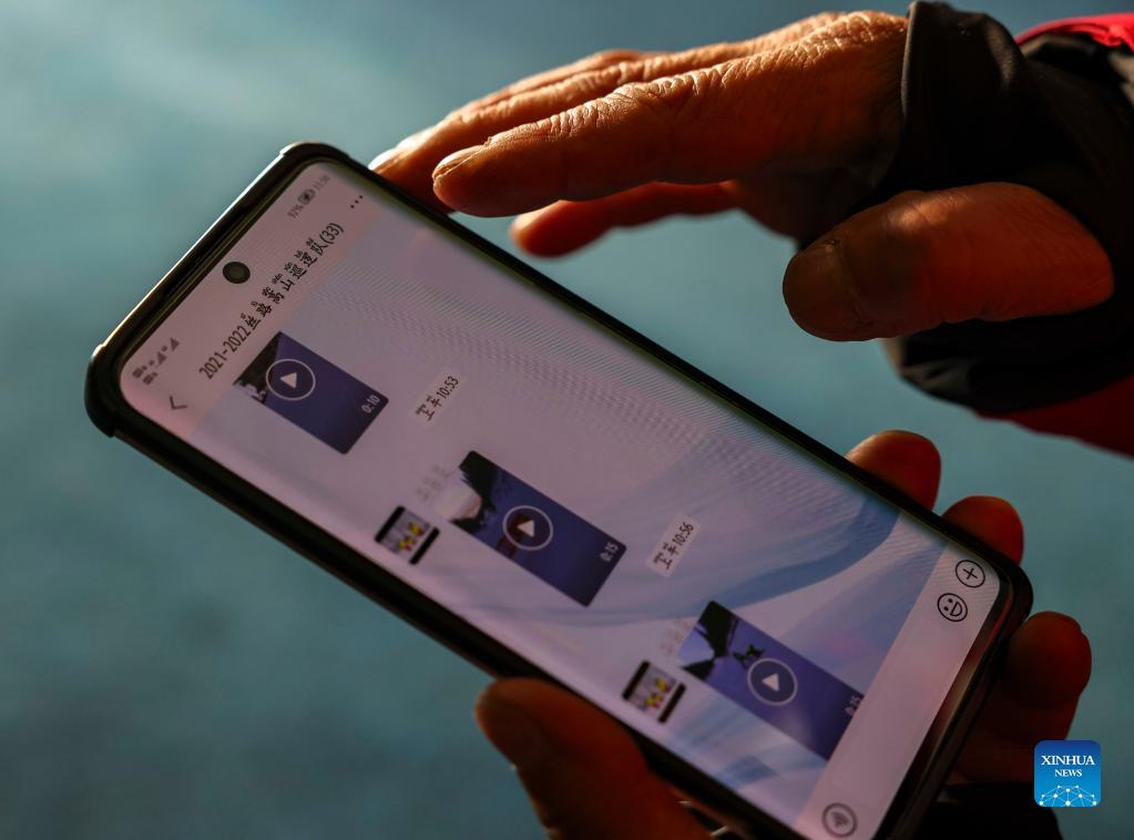 Photo taken on Jan. 10, 2022 shows Talhat Satayr checking on working conditions of his colleagues within a WeChat chatroom in Urumqi, northwest China's Xinjiang Uygur Autonomous Region. Talhat Satayr, 45, is the captain of the ski patrol team, which provides rescue services for tourists in need, at Silkroad Resort in Urumqi of Xinjiang. During his early life, he spent most of his time on the pastures along the canyons on Tianshan Mountain. He began to work at Silkroad Resort, which is not far away from his home in Urumqi, 16 years ago. Being a ski patroller is not an easy job, yet Talhat knows well the responsibilities on the shoulders of him and his teammates. He has been sent to Italy and northeast China's Jilin Province to learn professional rescue knowledge and skills at ski resort. Just like Talhat, more and more people in Xinjiang now have benefited from the development of winter sports. (Xinhua/Hu Huhu)