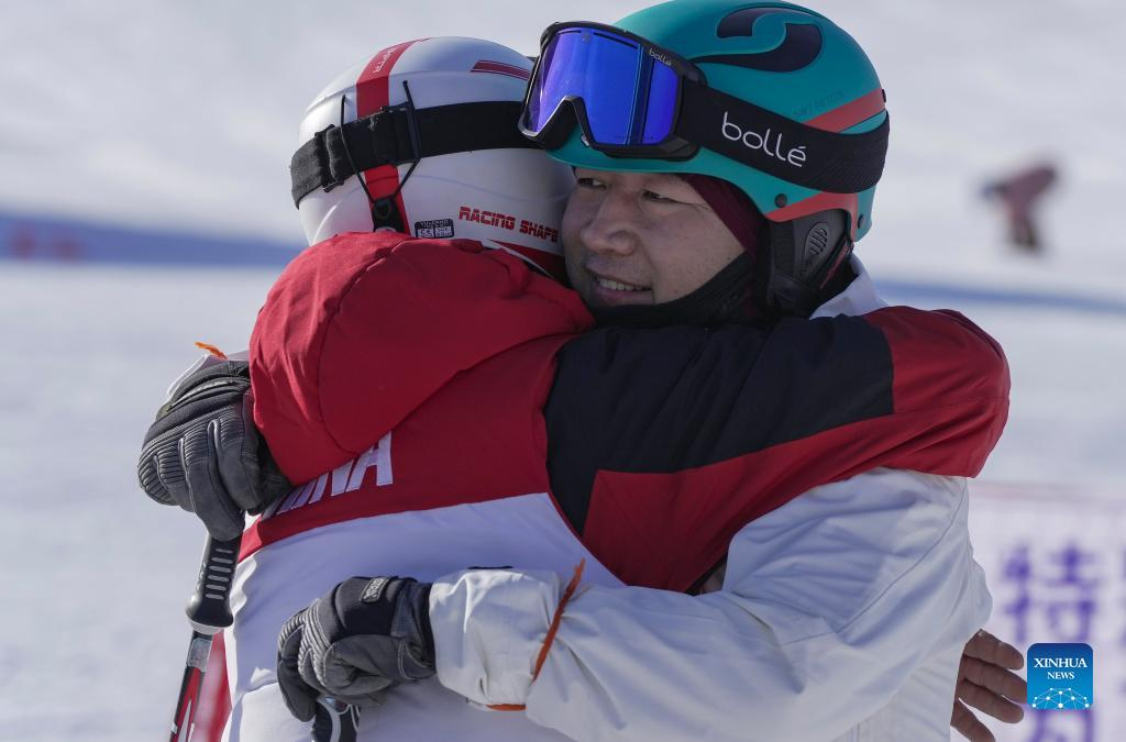 Talhat Satayr (L) hugs with Ma Dongxu, who was once rescued by Talhat, in Urumqi, northwest China's Xinjiang Uygur Autonomous Region, Jan. 11, 2022. Talhat Satayr, 45, is the captain of the ski patrol team, which provides rescue services for tourists in need, at Silkroad Resort in Urumqi of Xinjiang. During his early life, he spent most of his time on the pastures along the canyons on Tianshan Mountain. He began to work at Silkroad Resort, which is not far away from his home in Urumqi, 16 years ago. Being a ski patroller is not an easy job, yet Talhat knows well the responsibilities on the shoulders of him and his teammates. He has been sent to Italy and northeast China's Jilin Province to learn professional rescue knowledge and skills at ski resort. Just like Talhat, more and more people in Xinjiang now have benefited from the development of winter sports. (Xinhua/Hu Huhu)