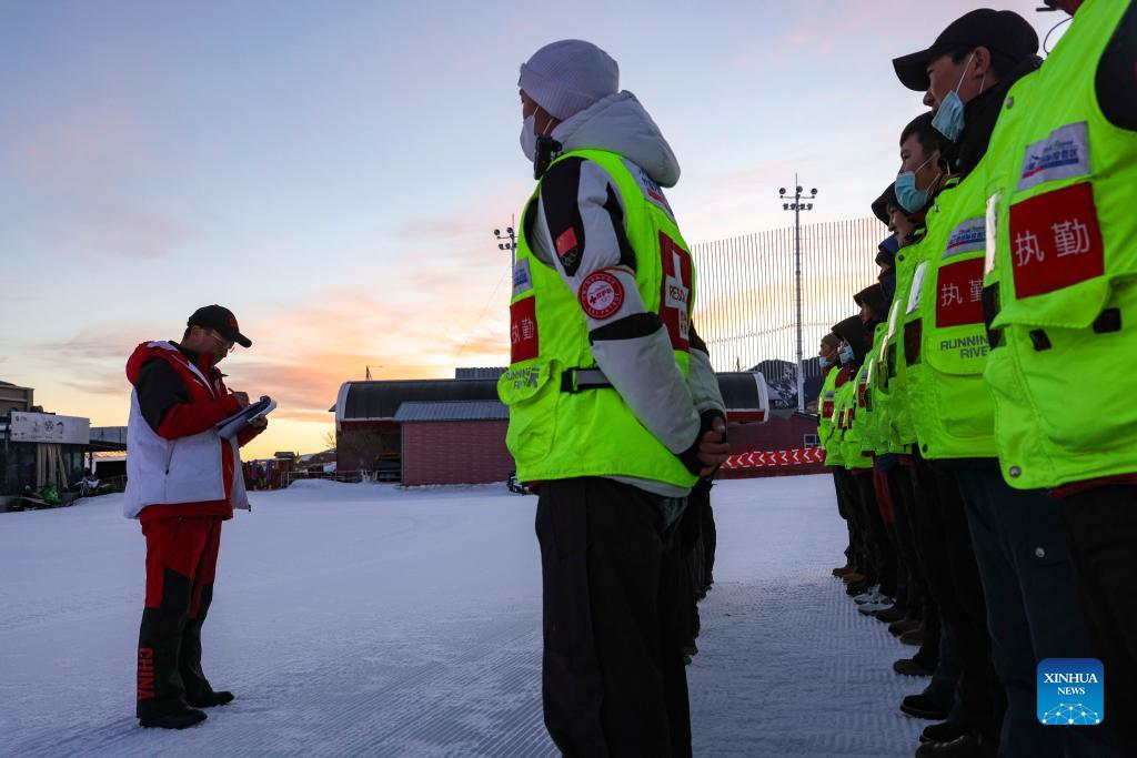 Photo taken on Jan. 10, 2022 shows Talhat Satayr (1st L) calling the roll of his potral team at Silkroad Resort in Urumqi, northwest China's Xinjiang Uygur Autonomous Region. Talhat Satayr, 45, is the captain of the ski patrol team, which provides rescue services for tourists in need, at Silkroad Resort in Urumqi of Xinjiang. During his early life, he spent most of his time on the pastures along the canyons on Tianshan Mountain. He began to work at Silkroad Resort, which is not far away from his home in Urumqi, 16 years ago. Being a ski patroller is not an easy job, yet Talhat knows well the responsibilities on the shoulders of him and his teammates. He has been sent to Italy and northeast China's Jilin Province to learn professional rescue knowledge and skills at ski resort. Just like Talhat, more and more people in Xinjiang now have benefited from the development of winter sports. (Xinhua/Hu Huhu)