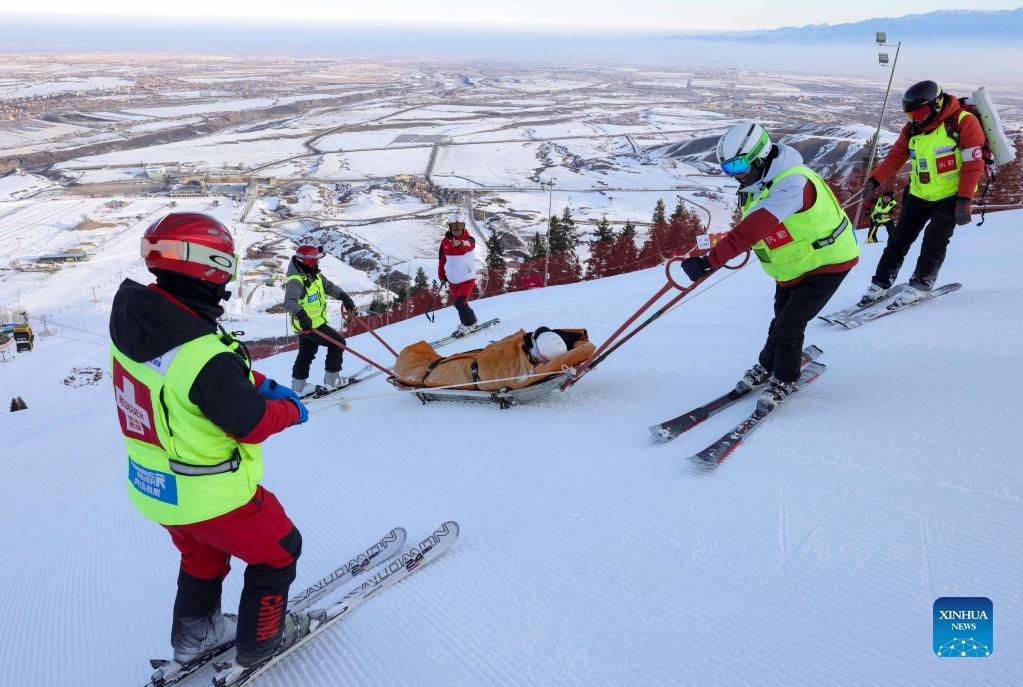 Talhat Satayr (3rd L) directs his colleagues to rescue an "injured skier" during a drill at Silkroad Resort in Urumqi, northwest China's Xinjiang Uygur Autonomous Region, Jan. 11, 2022. Talhat Satayr, 45, is the captain of the ski patrol team, which provides rescue services for tourists in need, at Silkroad Resort in Urumqi of Xinjiang. During his early life, he spent most of his time on the pastures along the canyons on Tianshan Mountain. He began to work at Silkroad Resort, which is not far away from his home in Urumqi, 16 years ago. Being a ski patroller is not an easy job, yet Talhat knows well the responsibilities on the shoulders of him and his teammates. He has been sent to Italy and northeast China's Jilin Province to learn professional rescue knowledge and skills at ski resort. Just like Talhat, more and more people in Xinjiang now have benefited from the development of winter sports. (Xinhua/Hu Huhu)