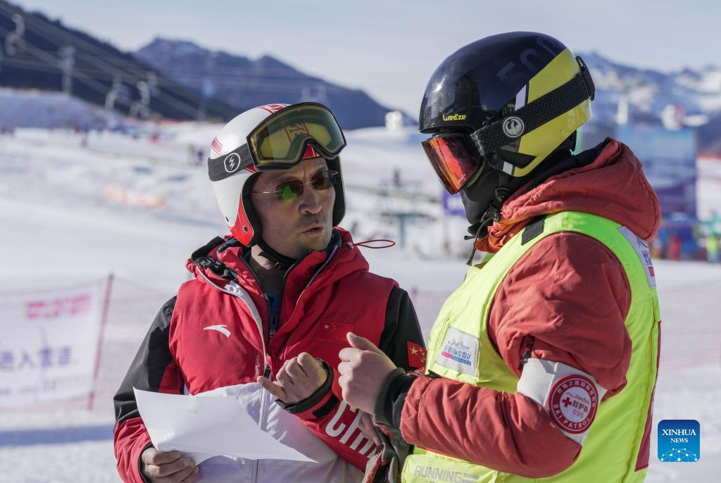 Talhat Satayr (L) talks to his colleague at Silkroad Resort in Urumqi, northwest China's Xinjiang Uygur Autonomous Region, Jan. 11, 2022. Talhat Satayr, 45, is the captain of the ski patrol team, which provides rescue services for tourists in need, at Silkroad Resort in Urumqi of Xinjiang. During his early life, he spent most of his time on the pastures along the canyons on Tianshan Mountain. He began to work at Silkroad Resort, which is not far away from his home in Urumqi, 16 years ago. Being a ski patroller is not an easy job, yet Talhat knows well the responsibilities on the shoulders of him and his teammates. He has been sent to Italy and northeast China's Jilin Province to learn professional rescue knowledge and skills at ski resort. Just like Talhat, more and more people in Xinjiang now have benefited from the development of winter sports. (Xinhua/Hu Huhu)