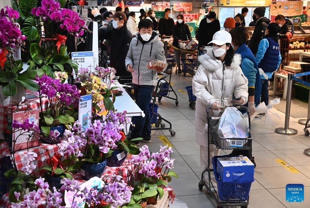 Residents shop at a supermarket in Qujiang New District of Xi'an, northwest China's Shaanxi Province, Jan. 15, 2022. (Xinhua/Tao Ming)