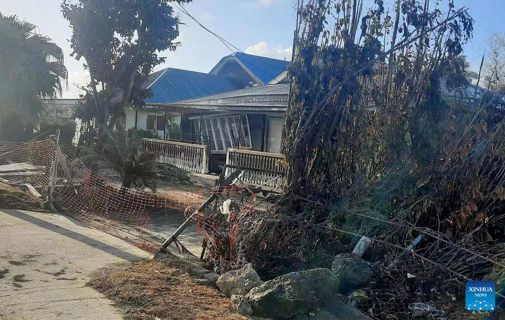 Photo taken on Jan. 20, 2022 shows houses and infrastructures hit by tsunami in Nuku'alofa, capital of Tonga. On Friday and Saturday, the Hunga Tonga-Hunga Ha'apai volcano in Tonga erupted violently and triggered tsunami in Tonga. (Photo by Marian Kupu/Xinhua)