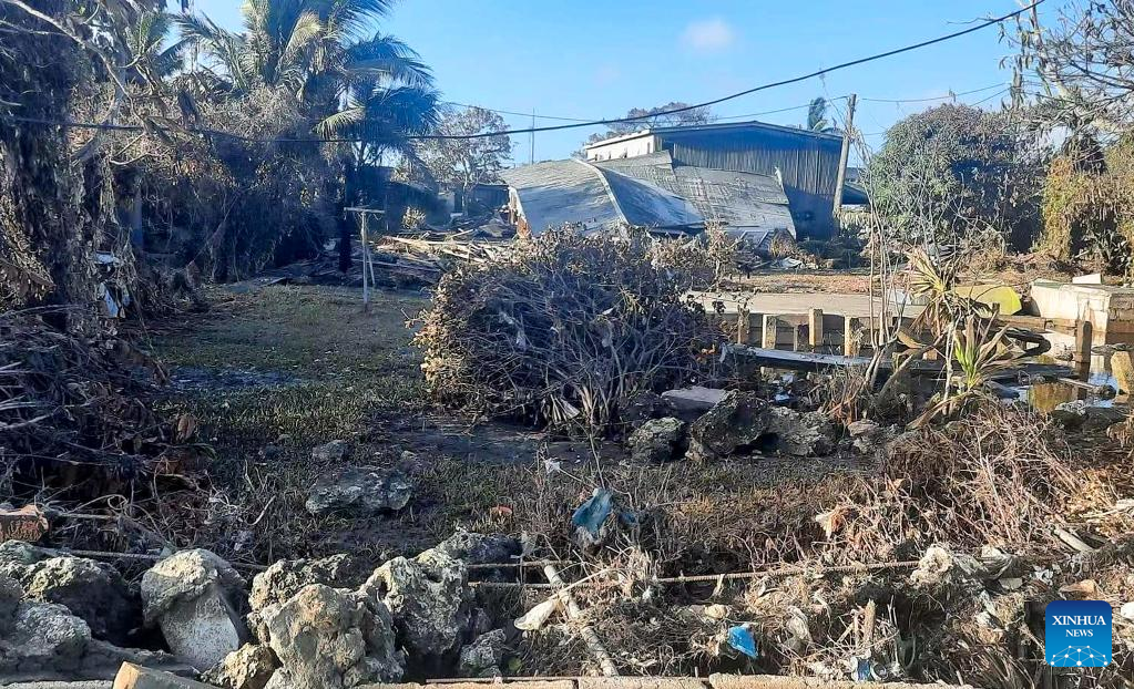 Photo taken on Jan. 20, 2022 shows houses and infrastructures hit by tsunami in Nuku'alofa, capital of Tonga. On Friday and Saturday, the Hunga Tonga-Hunga Ha'apai volcano in Tonga erupted violently and triggered tsunami in Tonga. (Photo by Marian Kupu/Xinhua)