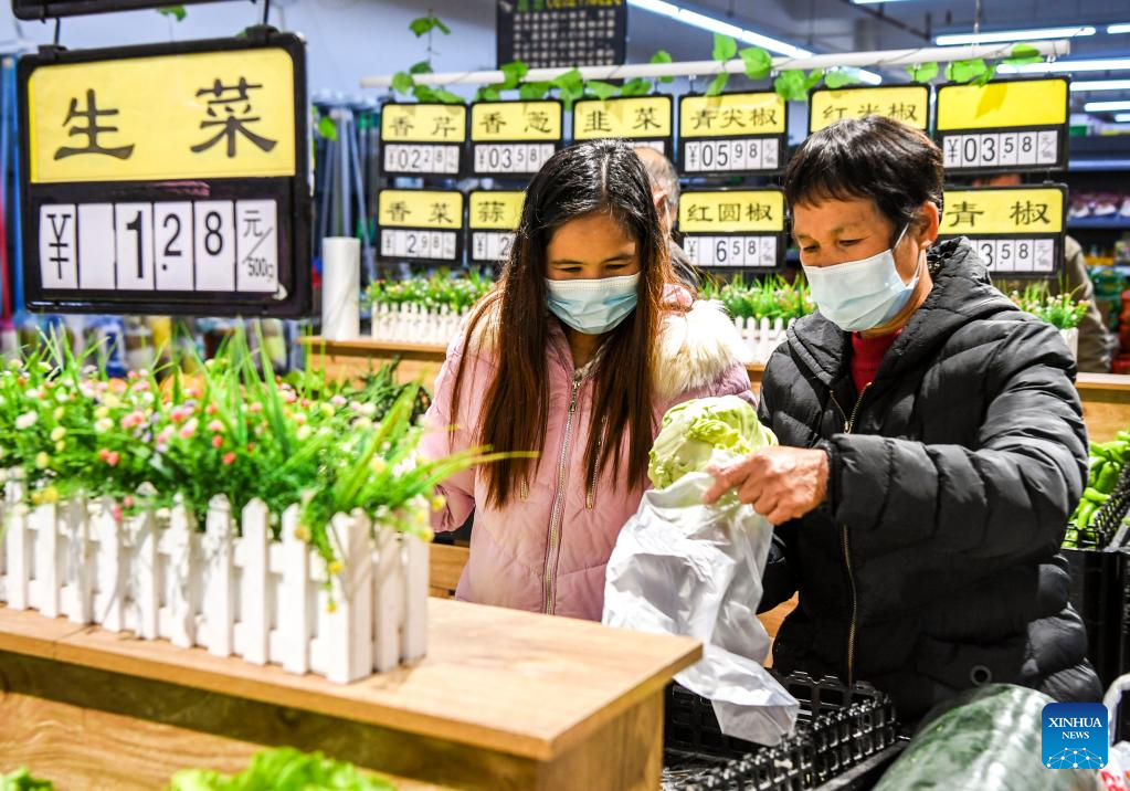 Residents buy vegetables at a supermarket in a relocation site for poverty alleviation in Xingye County, south China's Guangxi Zhuang Autonomous Region, Jan. 18, 2022. Located in Chengxi community of Xingye County, the relocation site for poverty alleviation in Guangxi has more than 5,600 residents. Local authorities has constructed a series of supporting infrastructure and facilities to improve people's living and working conditions. (Xinhua/Cao Yiming)