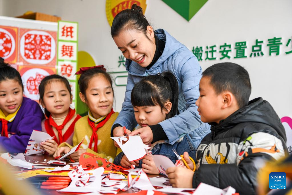 Children learn paper-cutting at a relocation site for poverty alleviation in Xingye County, south China's Guangxi Zhuang Autonomous Region, Jan. 18, 2022. Located in Chengxi community of Xingye County, the relocation site for poverty alleviation in Guangxi has more than 5,600 residents. Local authorities has constructed a series of supporting infrastructure and facilities to improve people's living and working conditions. (Xinhua/Cao Yiming)