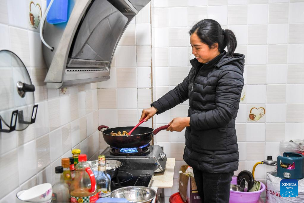 A resident cooks at home in a relocation site for poverty alleviation in Xingye County, south China's Guangxi Zhuang Autonomous Region, Jan. 18, 2022. Located in Chengxi community of Xingye County, the relocation site for poverty alleviation in Guangxi has more than 5,600 residents. Local authorities has constructed a series of supporting infrastructure and facilities to improve people's living and working conditions. (Xinhua/Cao Yiming)