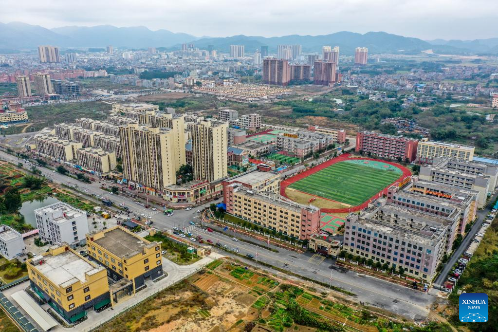 Aerial photo taken on Jan. 18, 2022 shows a relocation site for poverty alleviation in Xingye County, south China's Guangxi Zhuang Autonomous Region. Located in Chengxi community of Xingye County, the relocation site for poverty alleviation in Guangxi has more than 5,600 residents. Local authorities has constructed a series of supporting infrastructure and facilities to improve people's living and working conditions. (Xinhua/Cao Yiming)