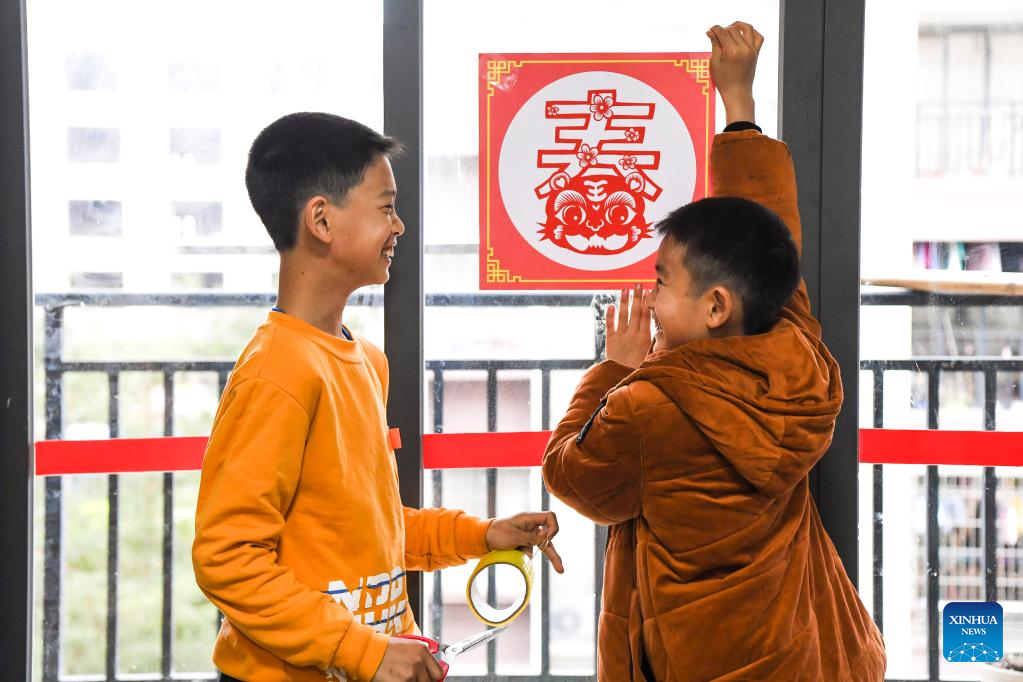 Children paste paper-cutting artwork at home in a relocation site for poverty alleviation in Xingye County, south China's Guangxi Zhuang Autonomous Region, Jan. 18, 2022. Located in Chengxi community of Xingye County, the relocation site for poverty alleviation in Guangxi has more than 5,600 residents. Local authorities has constructed a series of supporting infrastructure and facilities to improve people's living and working conditions. (Xinhua/Cao Yiming)