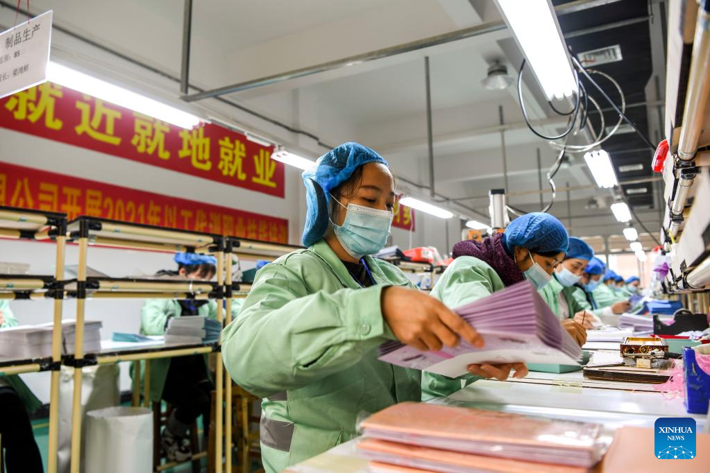 People work at the workshop of a paper product company in a relocation site for poverty alleviation in Xingye County, south China's Guangxi Zhuang Autonomous Region, Jan. 18, 2022. Located in Chengxi community of Xingye County, the relocation site for poverty alleviation in Guangxi has more than 5,600 residents. Local authorities has constructed a series of supporting infrastructure and facilities to improve people's living and working conditions. (Xinhua/Cao Yiming)