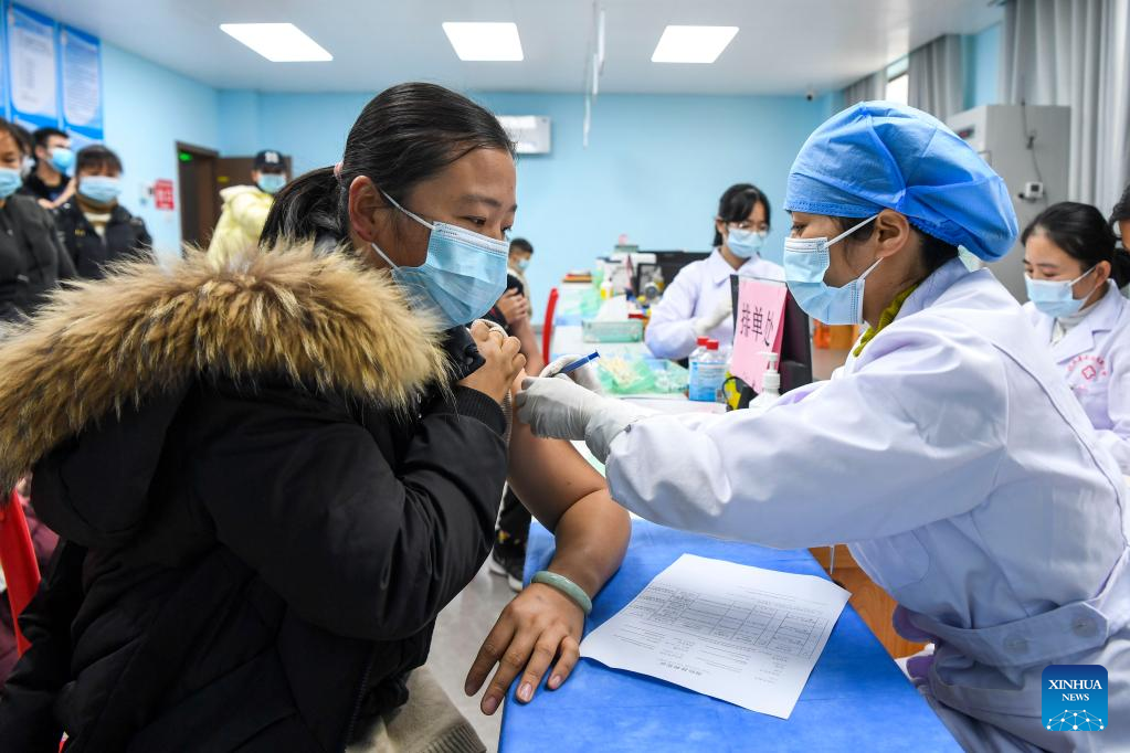 A resident receives a dose of COVID-19 vaccine at a hospital near a relocation site for poverty alleviation in Xingye County, south China's Guangxi Zhuang Autonomous Region, Jan. 18, 2022. Located in Chengxi community of Xingye County, the relocation site for poverty alleviation in Guangxi has more than 5,600 residents. Local authorities has constructed a series of supporting infrastructure and facilities to improve people's living and working conditions. (Xinhua/Cao Yiming)