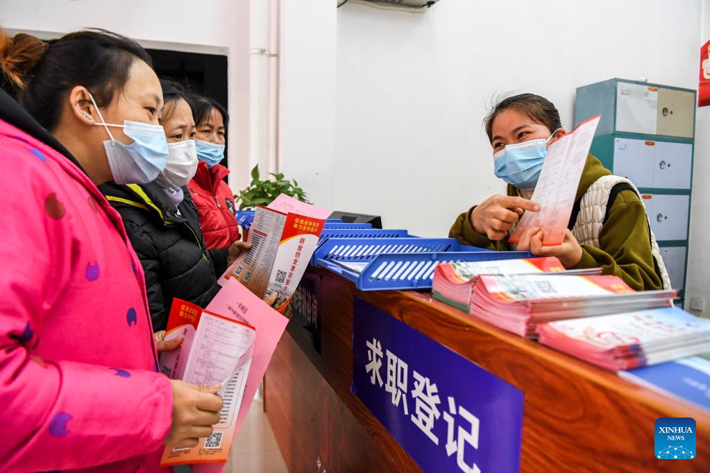 A staff member briefs policies to residents at an employment service center of a relocation site for poverty alleviation in Xingye County, south China's Guangxi Zhuang Autonomous Region, Jan. 18, 2022. Located in Chengxi community of Xingye County, the relocation site for poverty alleviation in Guangxi has more than 5,600 residents. Local authorities has constructed a series of supporting infrastructure and facilities to improve people's living and working conditions. (Xinhua/Cao Yiming)