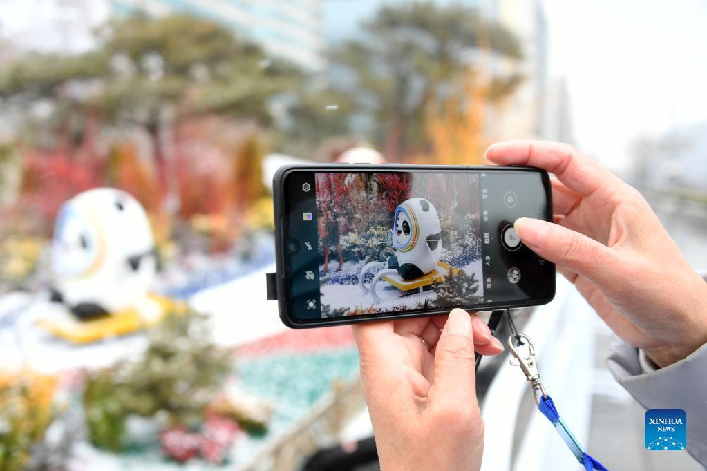 A pedestrain takes pictures of decorative installations themed on Beijing 2022 Olympic Winter Games in Beijing, capital of China, Jan. 20, 2022. (Xinhua/Ren Chao)